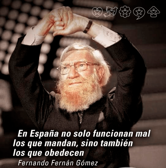 Siempre impresionaban las declaraciones de Fernando Fernán-Gómez, duras a veces, pero cargadas de una gran reflexión y memoria del tiempo, sus últimas imágenes de entrega de premios que el cine le reconocía por su carrera, nos sorprendía con aquel saludo curioso y desconocido para la mayoría, con las manos entrelazadas sobre su cabeza, saludaba al mundo, con aquel gesto libertario de fraternidad y solidaridad obrera.