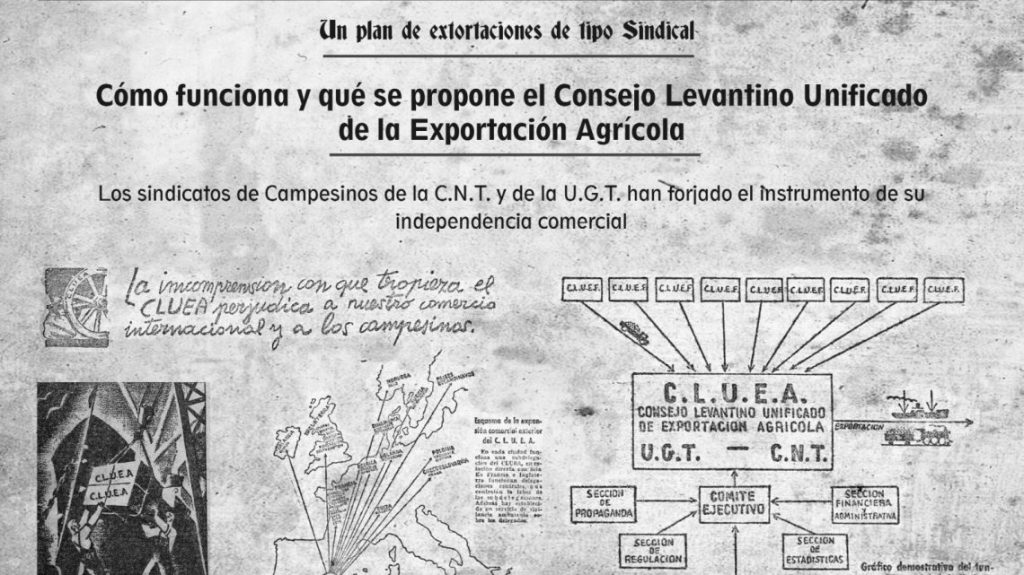 Entre centenas de colectivos que proliferaron durante los tres años que duró la revolución social, ¿por qué desgranar y destacar el Comité Levantino Unificado de Exportación de Agrios? El CLUEA es una creación colectiva de la CNT-AIT y la UGT que afectaba a un sector importante de la economía y de las exportaciones agrícolas al extranjero, y que debió de resolver a gran escala una serie de problemas económicos inmediatos 2 y otros descritos brevemente a continuación.Si en casi todas las zonas de la península y en las colonias, la amenaza militar y fascista acabó fraguándose el 20 o el 21 de julio, como es el caso de ciudades como Cartagena, en otras como Valencia, fue el 31 de julio. El mes de agosto pasó a vislumbrar posibilidades de trabajo en común con los demás sectores en estas ciudades de la retaguardia. Así, en un Pleno de Federaciones Comarcales y Locales de la Confederación Regional de Levante (para preparar un dictamen sobre la Confederación y el Gobierno para el próximo pleno de Regionales), salían a la luz pública varias razones para desconfiar: