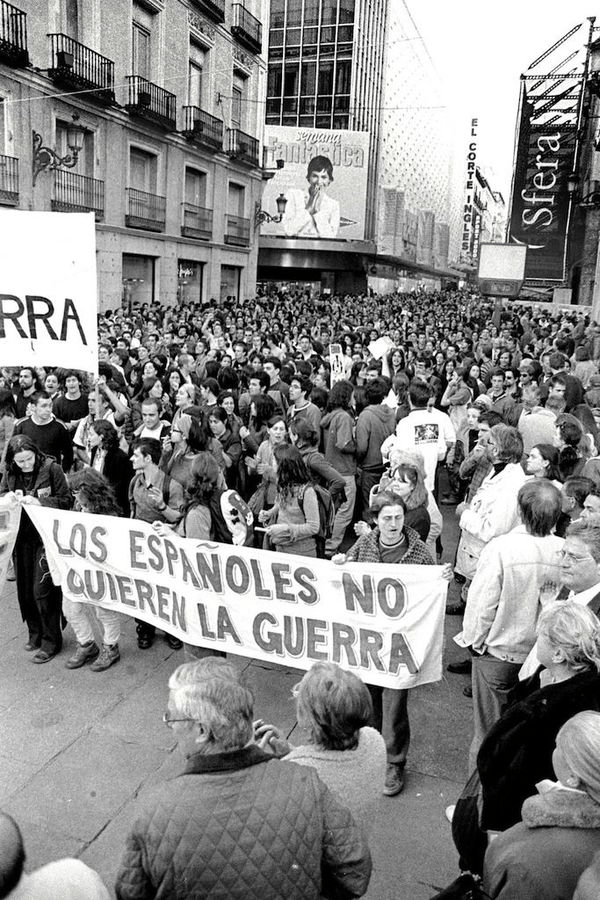 Las manifestaciones del “No a la guerra”, organizadas por grupos pacifistas, partidos de izquierda, asociaciones y sindicatos, reunieron el 15 de febrero de 2003 a varios millones de personas en todo el país, siendo las más grandes la de Madrid, con dos millones de manifestantes y Barcelona, con un millón y medio, seguidas de las de Valencia, Zaragoza, Sevilla, Oviedo y Valladolid.