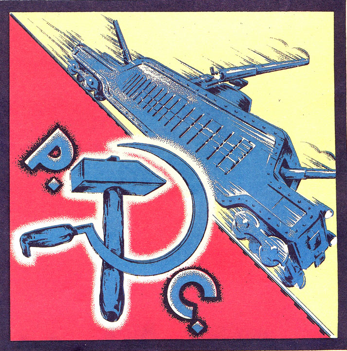 A su derecha, un cuadrado dividido en dos triángulos, el inferior en rojo y en amarillo el superior, corresponde al P.C.E. En la línea que divide ambos colores se sitúan los raíles, por los que circula a gran velocidad un tren blindado, provisto de grandes cañones y aberturas desde las que abren fuego los fusiles y ametralladoras. Bajo ellos, la hoz y el martillo aparecen en color azul, con obvias connotaciones negativas, y que podría tener que ver con la polémica decisión de Negrín de aceptar el traslado de las reservas de oro y plata del Banco de España a la Unión Soviética, a cambio de ayuda militar. Al hipotecar todas sus reservas de divisas, la República quedó a expensas de los asesores militares soviéticos que intentaron crear un ejército regular, bajo un mando único y una fuerte disciplina. Los miembros de las columnas anarquistas y del P.O.U.M. no aceptaron aquella injerencia por considerarla muy cercana a una dictadura que no estaban dispuestos a transigir, y de ahí que le asignaran el color azul de los fascistas que ambos estaban combatiendo.