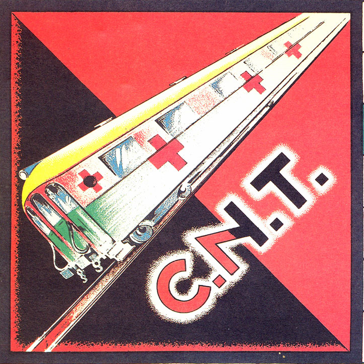 En la esquina inferior izquierda, sobre el fondo negro y rojo de la bandera anarquista de la C.N.T., vemos avanzar un tren hospital con el distintivo de la Cruz Roja. No sabemos si para asistir a los caídos en el frente o como presagio de las bajas que ocasionarán al enemigo. En cualquier caso, las dos asas de su vagón delantero podrían sugerir los senos de una enfermera, vestida con el uniforme blanco y ataviada con la cofia, en alusión al papel desempeñado por Federica Montseny en la cartera de Sanidad y Asistencia Social. Y al mismo tiempo supone un homenaje del sindicato anarquista a la mujer, tanto a aquellas que se quedaron en la retaguardia al cuidado de los heridos, como a aquella otras que tomaron un arma para luchar, hombro con hombro, junto a sus compañeros varones, en la defensa de la República.
