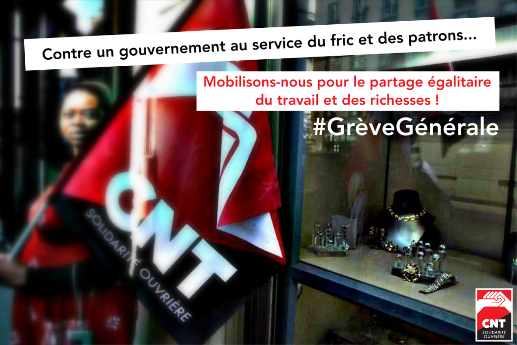 Para la CNT-Solidarité Ouvrière, un sindicato revolucionario, nuestra lucha no puede detenerse en un poco más de «justicia social» en el marco del sistema actual. Mortífero para el planeta, basado en la explotación del trabajo del mayor número por una minoría, no existe un capitalismo con rostro humano. La distribución igualitaria de la riqueza y el trabajo sólo puede lograrse en el marco de una ruptura con el capitalismo. Es por esta transformación social que estamos trabajando.