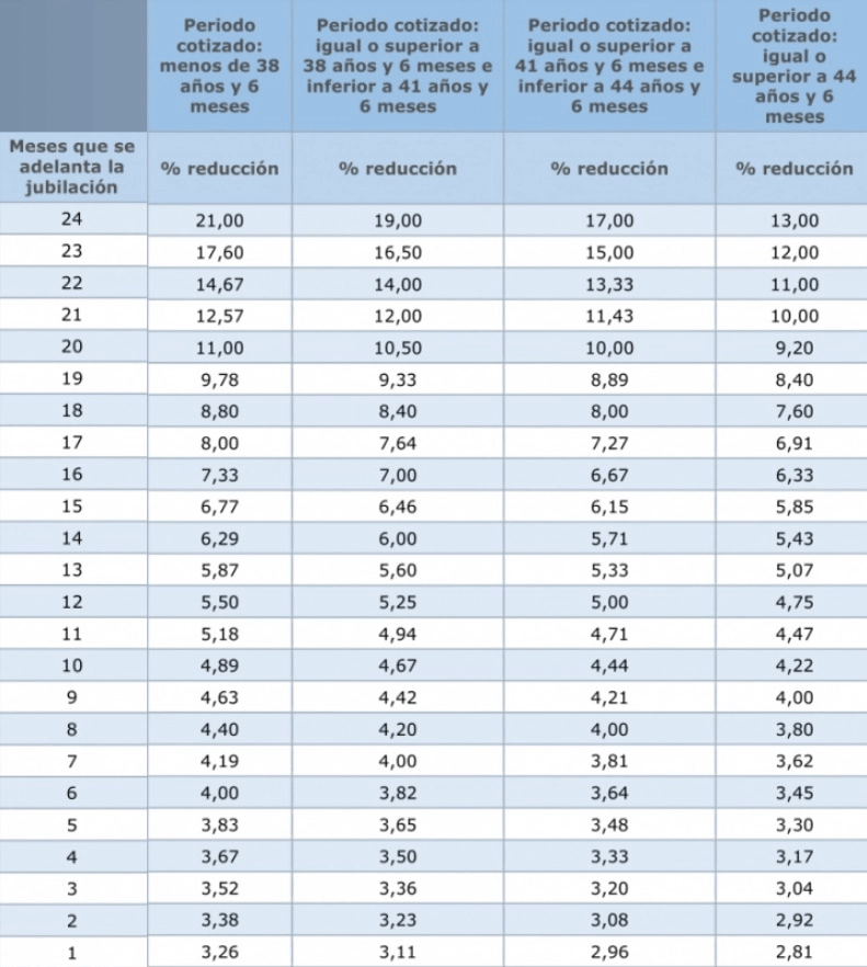 Así, la pensión en una jubilación voluntaria queda reducida entre un 21% y un 3,26% dependiendo si se adelanta 24 meses o un solo mes.