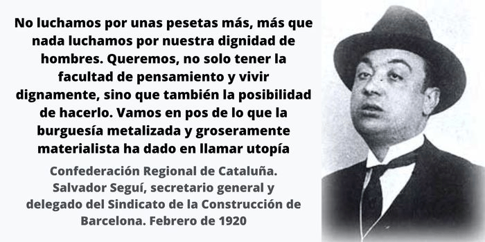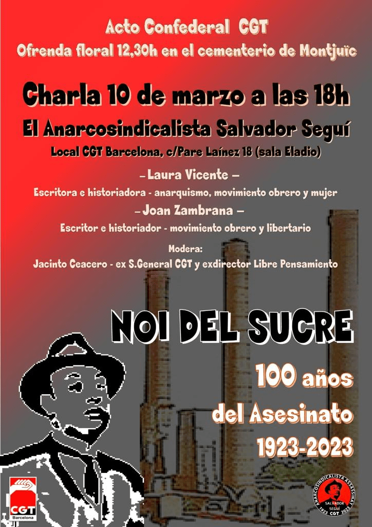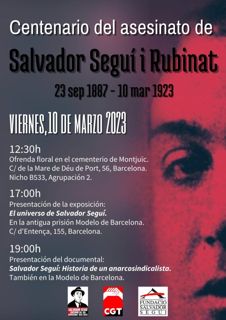 Empieza la cuenta atrás para los actos del Centenario del asesinato de Salvador Seguí y otros muchos militantes anarcosindicalistas de la época, a manos de pistoleros al servicio de la patronal y el Estado, estos actos se organizan por la CGT y la Fundación Salvador Seguí, así como otras entidades libertarias de la ciudad de Barcelona.