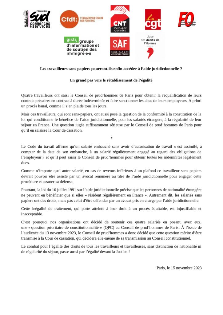 Sin embargo, la ley del 10 de julio de 1991 sobre asistencia jurídica gratuita especifica que las personas de nacionalidad extranjera sólo pueden beneficiarse de ella si «residan regularmente en Francia». En otras palabras, los empleados indocumentados tienen derechos, pero no el derecho a ser defendidos por un abogado con asistencia jurídica.