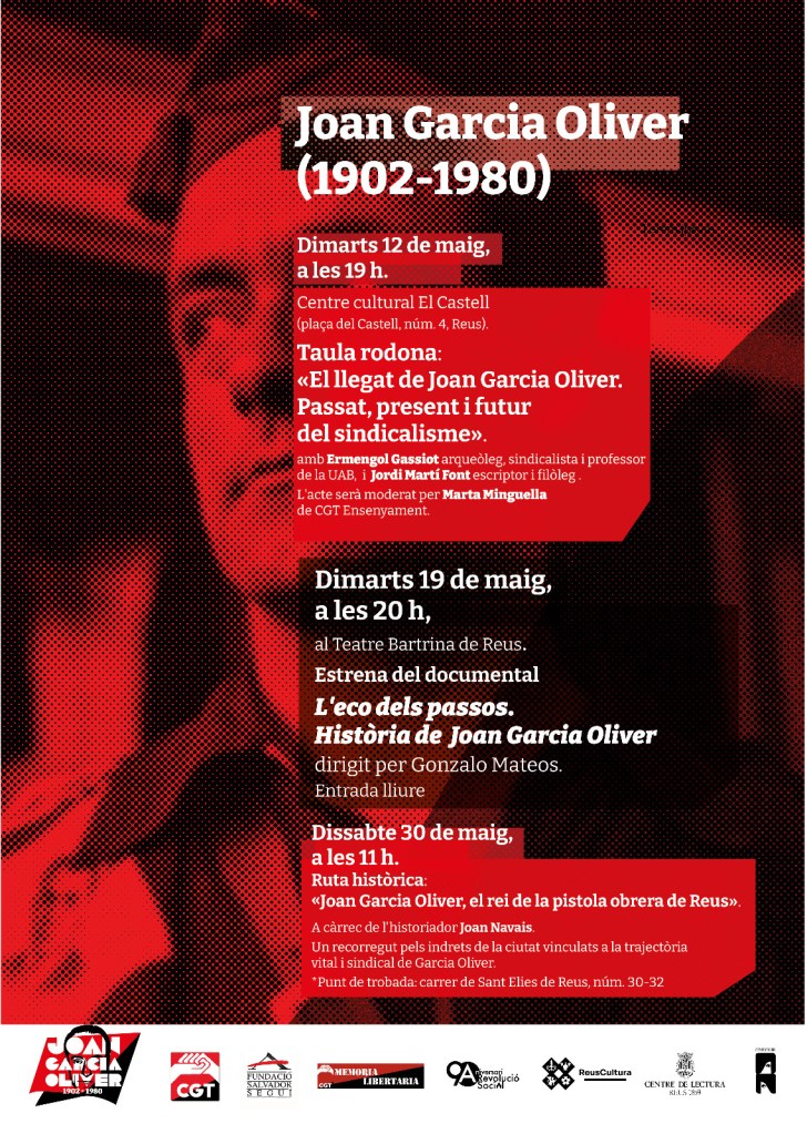 Ruta histórica «Joan Garcia Oliver: el rey de la pistola obrera de Reus», a cargo del historiador Joan Navais. Un recorrido por los lugares de la ciudad vinculados a la trayectoria vital y sindical de Garcia Oliver.